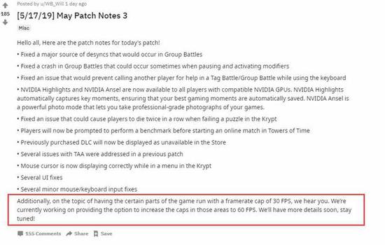“另外,有玩家抱怨在游戏的某些场景有30帧率上限的问题,我们已经了解了。我们目前正在努力提供为这些场景的上限增加到60 FPS 的选择。 我们很快会有更多的细节披露,敬请期待!”